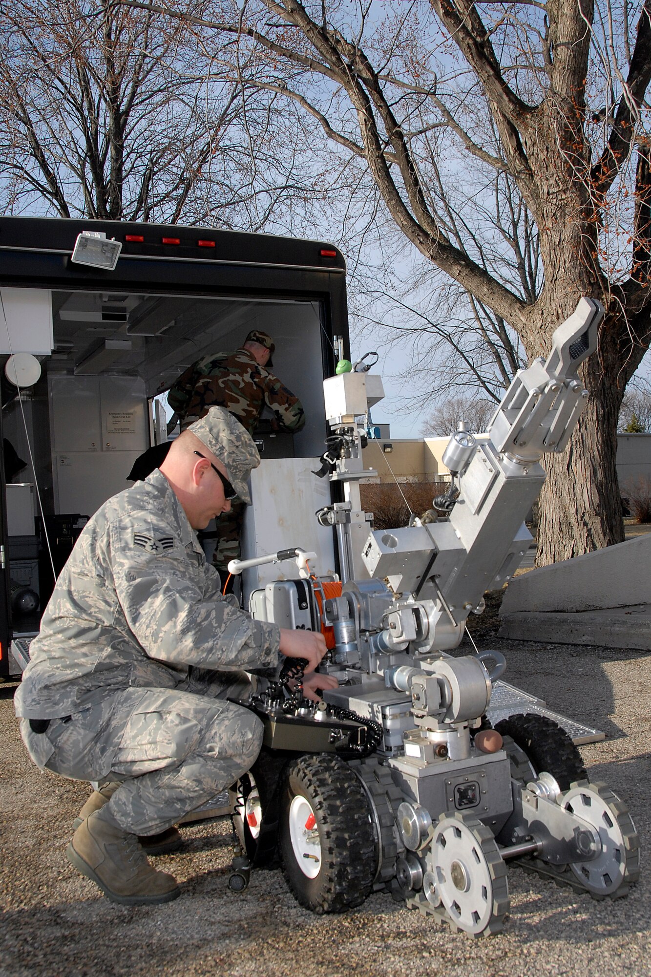 Truax hosts joint 'suspicious' package exercise Published March 31, 2009 By Staff Sgt. Jon LaDue 115th Fighter Wing Public Affairs TRUAX FIELD, WIS. -- "For the Commander Truax Field" Emergency responders got the call shortly after it was discovered -- approximately 7:40 a.m. They weren't exactly sure what they were responding to, but it was "suspicious." It was a small cardboard box, taped up and found in the command suite of Bldg. 500. It was addressed to the commander with no return address, no postage paid, not even a real address. The suspicious package exercise was held March 18 on Truax Field as part of a yearly requirement to test the emergency management and response capabilities for natural or man-made threats. The exercise involved every group on base and a few external organizations as well. "The exercise was intended to test the capabilities of each responding element working together under Air Force Emergency Management and communication processes. It's rare that all agencies are given the opportunity to work together and see what each agency brings to the (table)," said Senior Master Sgt. Christopher Lemke, 115th Security Forces Squadron. Tech. Sgt. Stephanie Miles, 115 FW, discovered the package and, according to exercise evaluators, acted appropriately and in line with what today's Airmen are trained to do. "Sergeant Miles did an outstanding job of recognizing the package did not belong in the area," said Lt Col John Gaedke, 115th Mission Support Group. "She sounded the alarm, which then activated all emergency response forces." Security forces quickly set up a cordon around the building and were the first to evaluate the package. The 115th Explosive Ordnance Disposal flight then maneuvered their F6-A Andros hazardous duty robot up the stairs to the second floor of Bldg. 500 to assess the package. After the Explosive Ordnance Disposal team finished their examination of the package and found it to be free of any explosive threat, they turned it over to the 54th Civil Support Team to further evaluate the package. "It is rare that an exercise goes exactly as planned," said Sergeant Lemke. "In reality, it's the decisions and actions of the players that dictate how the exercise goes." In addition to the 115 FW's involvement, many agencies from outside the gate participated as well, to include the 54 CST, U.S. Postal Service Investigation, Federal Bureau of Investigation - Madison Office and the Wisconsin Joint Operation Center. "In the post 9/11 world, it is critical that all agencies can work and communicate with each other," said Col. Joseph Brandemuehl, 115th Fighter Wing Commander. "Everyone did a great job and really reinforced joint operations." The 54 CST responded with a decontamination trailer, equipment, personnel and a lot of experience and insight. Their primary role was to provide Chemical, Biological, Radiological and Nuclear response and support capabilities. They provided decontamination for 115 EOD equipment, which in a real-world situation could mean its availability for future contingencies. After a truly joint effort in recognizing, communicating, evaluating and neutralizing the threat, every player gained a little more experience and when the after action report is published, everyone will be able to take those lessons and apply them to future scenarios or even real-world events. "Exercises help us prepare and train for real world emergencies. They allow us to sit down afterward and evaluate every aspect of the scenario, to determine what worked well and what areas need attention," said Colonel Brandemuehl. "The more exercises we do, the better prepared we are when we deploy overseas or respond to a State or local emergency."