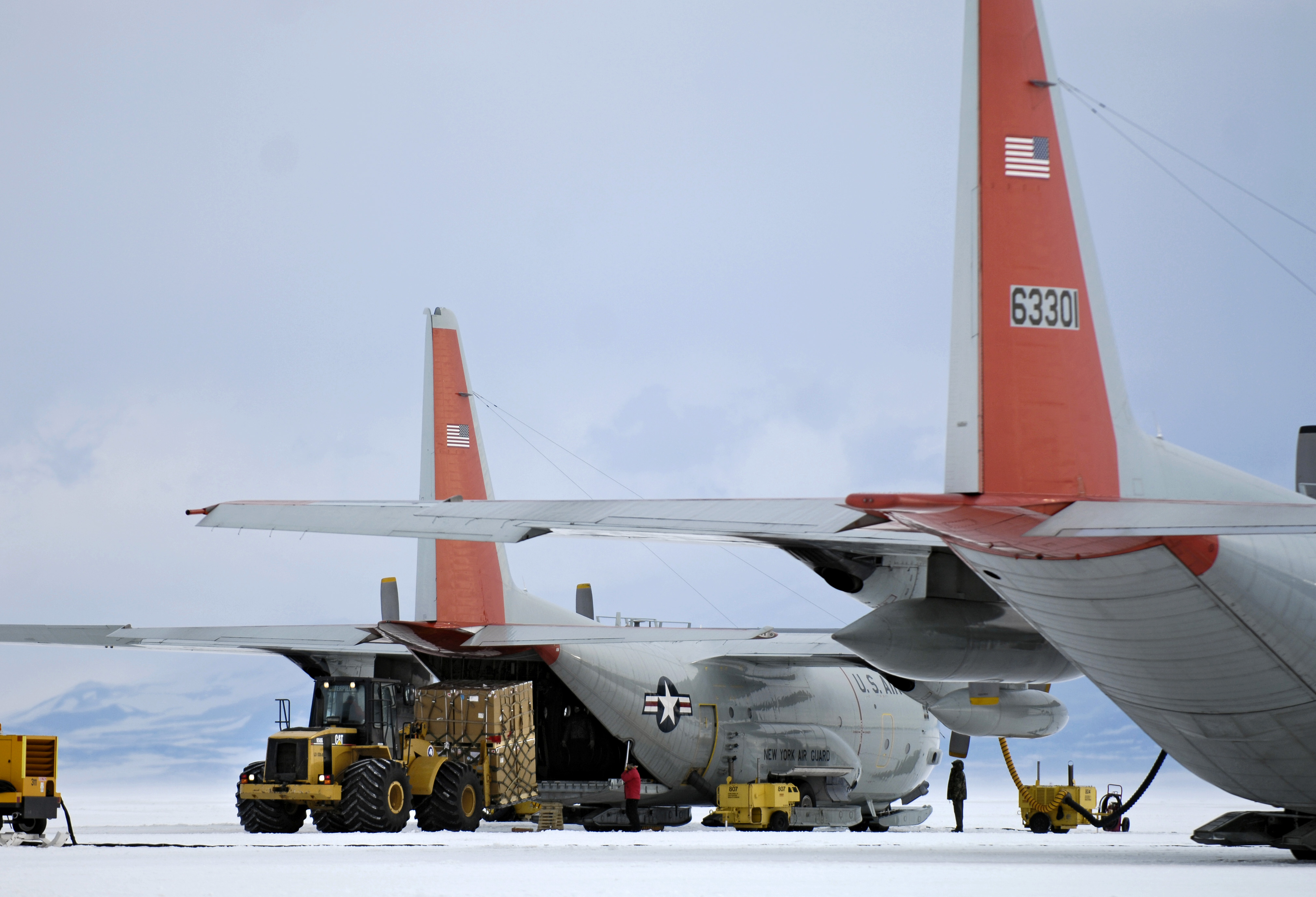 An LC-130 Hercules is loaded on the annual sea ice runway near McMurdo Station, Antarctica Nov. 26, 2007 during Operation Deep Freeze. Ski-equipped LC-130s, crews and support personnel from the New York Air National Guard’s 109th Airlift Wing are supporting the 13th Air Force-led Joint Task Force Support Forces Antarctica, Operation Deep Freeze. Operation Deep Freeze is a unique joint and total force mission that has supported the National Science Foundation and U.S. Antarctic Program that began in 1955. (U.S. Air Force photo/Tech. Sgt. Shane A. Cuomo)