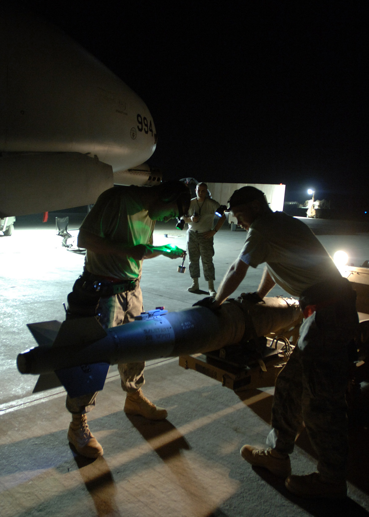 AL ASAD AIR BASE, Iraq -- Staff Sgt. Nick Draxler and Tech. Sgt. Frank Williams, 438th Air Expeditionary Group weapons loaders, verify a weapons checklist on a Joint Direct Attack Munition before loading it onto an A-10C Thunderbolt II here. Sergeants Draxler and Williams are deployed from the 175th Wing, Maryland Air National Guard, Baltimore. (U.S. Air Force photo/Tech. Sgt. D. Clare)