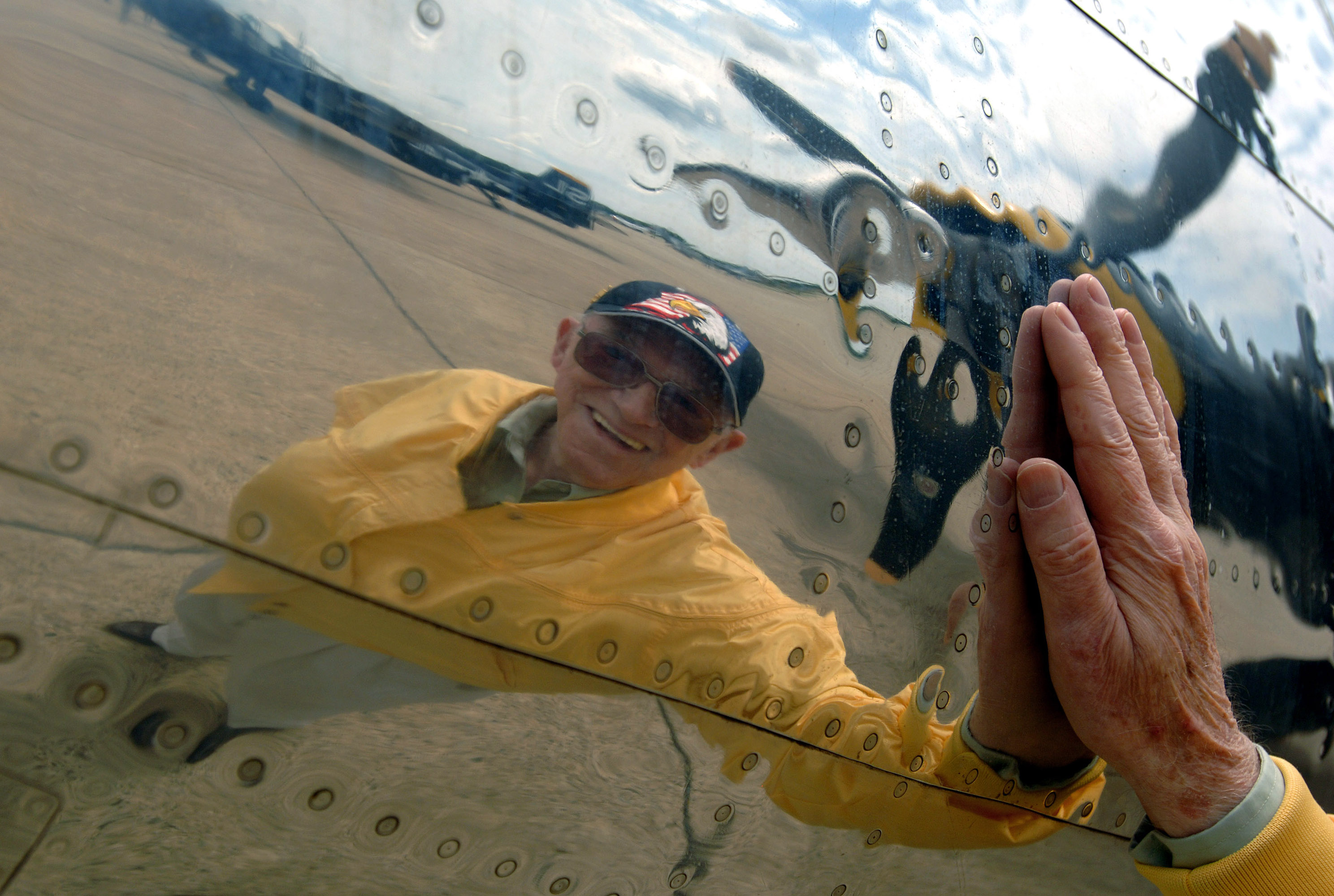 World War II veteran Robert McNally rubs his had against the "Miss Hap," the oldest flying B-25 Mitchell bomber in the world Aug. 19 at Pease Air National Guard Base at Portsmouth, N.H. The "Miss Hap" was the personal aircraft of Gen. Henry "Hap" Arnold, the commanding officer of the Army Air Corps during WW II. Mr. McNally was an aircraft radio operator in the Army Air Corps and routinely flew aboard B-25s during WW II. Mr. McNally, 81, was a guest attending the 2007 Wings of Hope Air Show with hopes of being reunited with old friends. The 2007 Wings of Hope Air Show at Pease ANGB is in conjunction with Air Force Week New England. (U.S. Air Force photo/Staff Sgt. Bennie J. Davis III)
