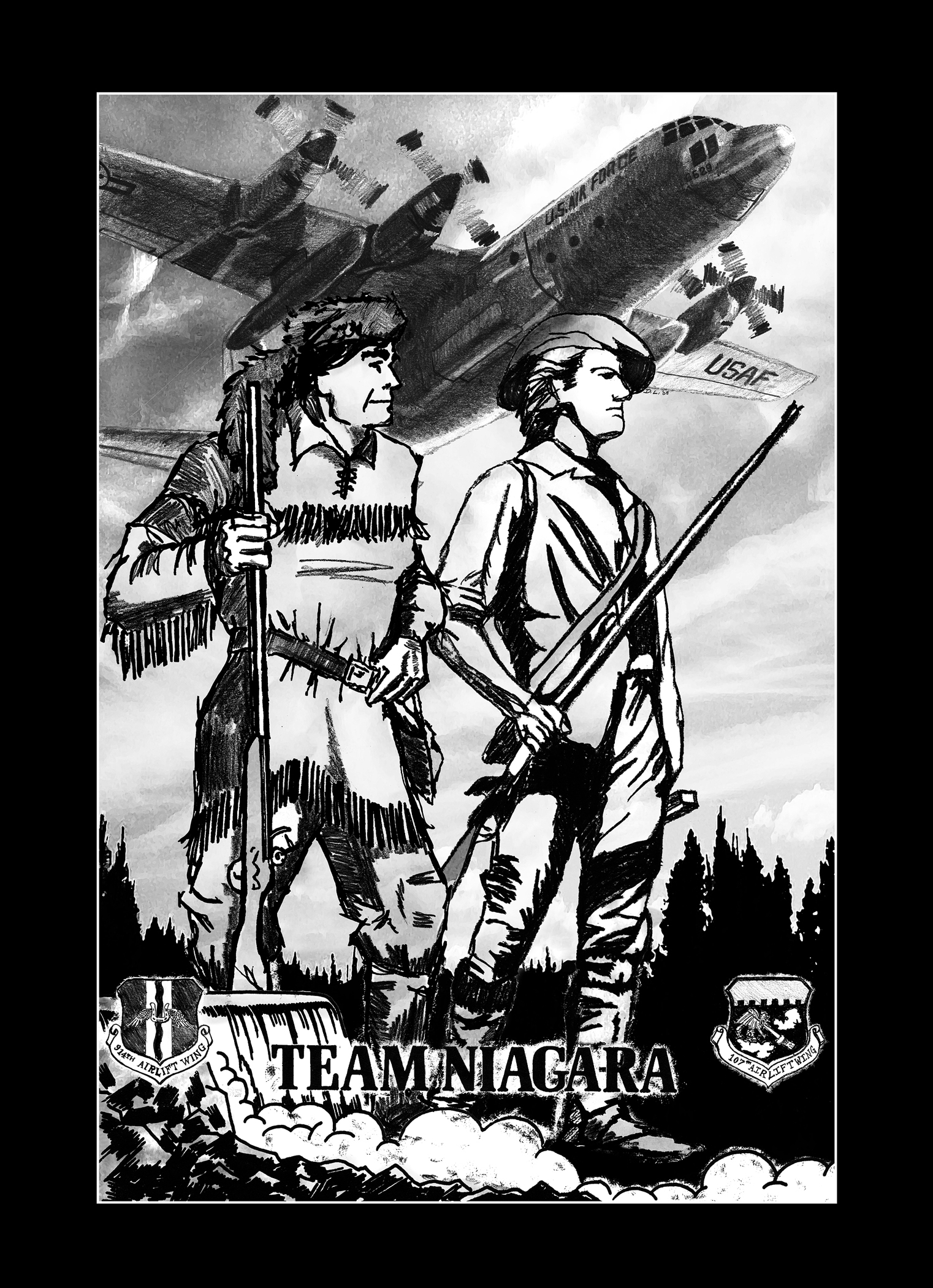 This hand-sketched artwork portrays the unity between the Air Force Reserve and the Air National Guard at Niagara Falls Air Reserve Station, N.Y. The Frontiersman on the left represents the 914th Airlift Wing (AFRC) and the Minuteman on the right represents the 107th Airlift Wing (NYANG). Standing over Niagara Falls, they symbolize Citizen Airmen united in defense of our nation. The C-130 represents the units' combined combat flying mission and this artwork commemorates the first ever Reserve/Guard C-130 association. (Artwork by Staff Sgt. Dan Lanphear)
