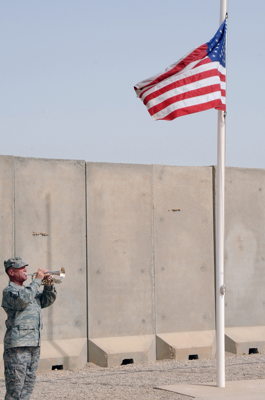 ALI BASE, Iraq -- Chief Master Sgt. William Davey, 407th Air Expeditionary Group superintendent, plays Taps at Memorial Square during a remembrance ceremony here May 26. The Airmen of the 407th Air Expeditionary Group gathered together in a Memorial Day ceremony held at 8:30 a.m. to remember those who have died fighting for freedom. Eight Airmen passed away this year in the Central Command area of responsibility and their names were read during the ceremony. Chief Davey is deployed from the Pennsylvania Air National Guard. (U.S. Air Force photo/Tech. Sgt. Sabrina Johnson)