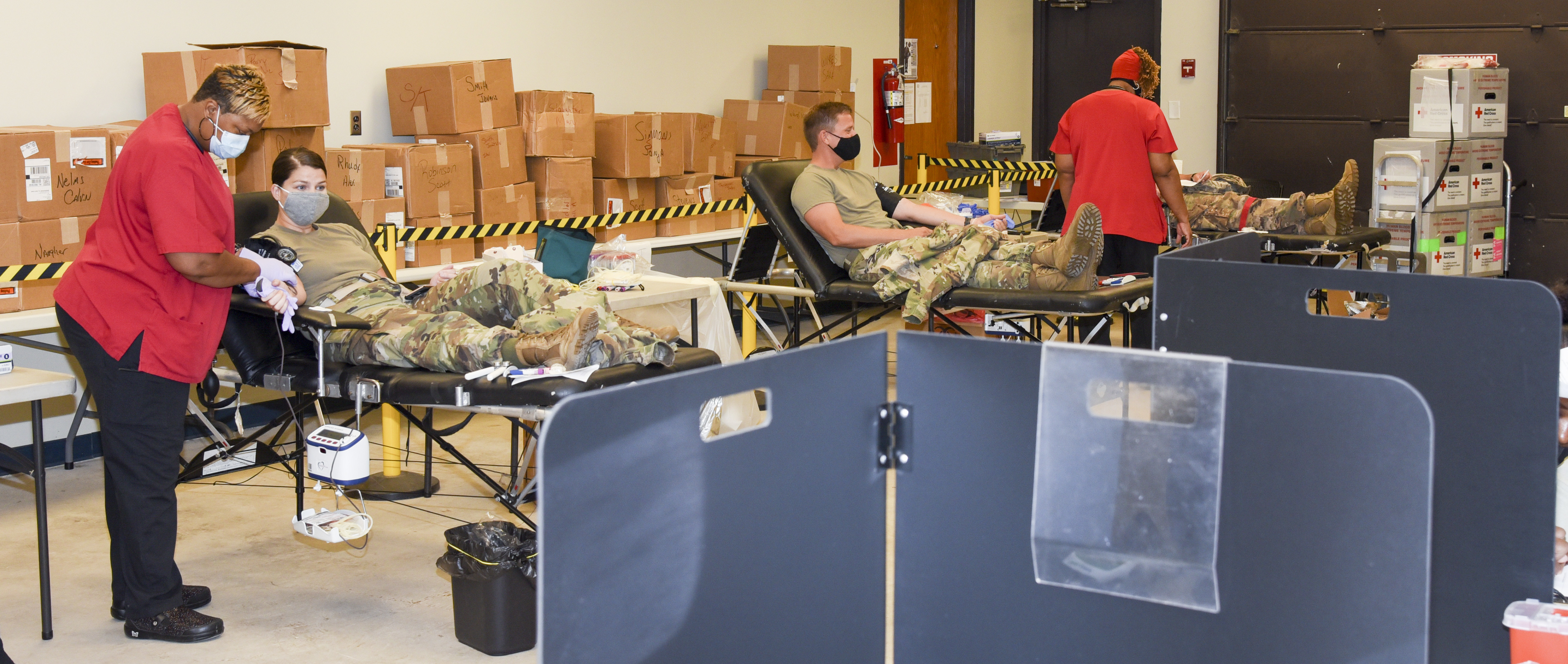 Members of the 117th Air Refueling Wing donate blood at Sumpter Smith Joint National Guard Base, Alabama, Aug. 14, 2020. The blood collected can be used for blood transfusions but some of the blood will be used to find COVID-19 antibodies in an effort to find a cure. (U.S. Air National Guard photo by Master Sgt. Jeremy Farson)