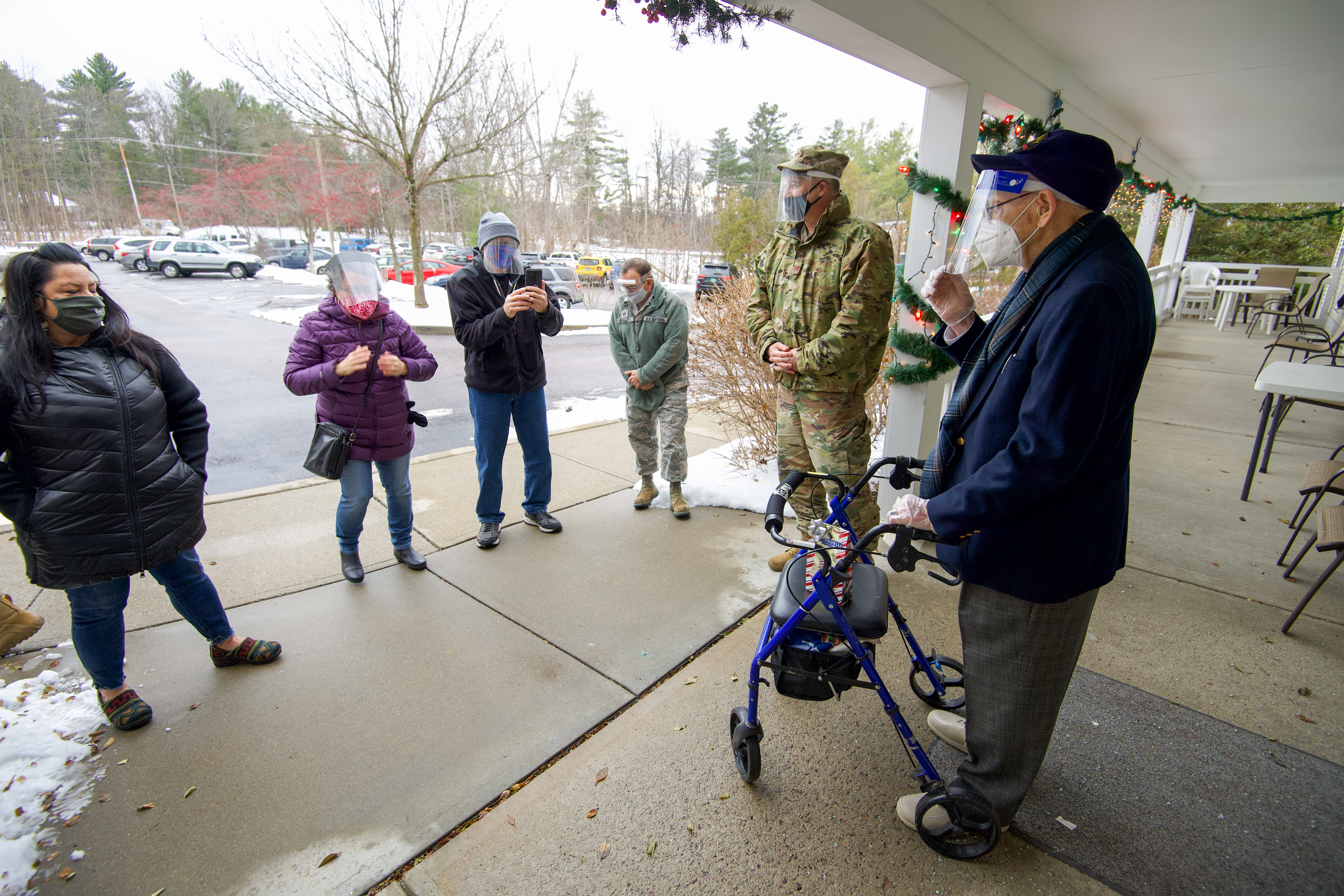 World War II veteran Lenny Roberge, Vermont’s oldest living veteran, says a few words of thanks to the Airmen of the Vermont Air National Guard at a small ceremony outside his nursing home in South Burlington, Vt., Dec. 22, 2020. In order to honor Roberge, Airmen from the 158th Fighter Wing had a flag flown in an F-35 during a combat training sortie over the mountains of Vermont and New York. (U.S. Air National Guard photo by Senior Master Sgt. Michael Davis)