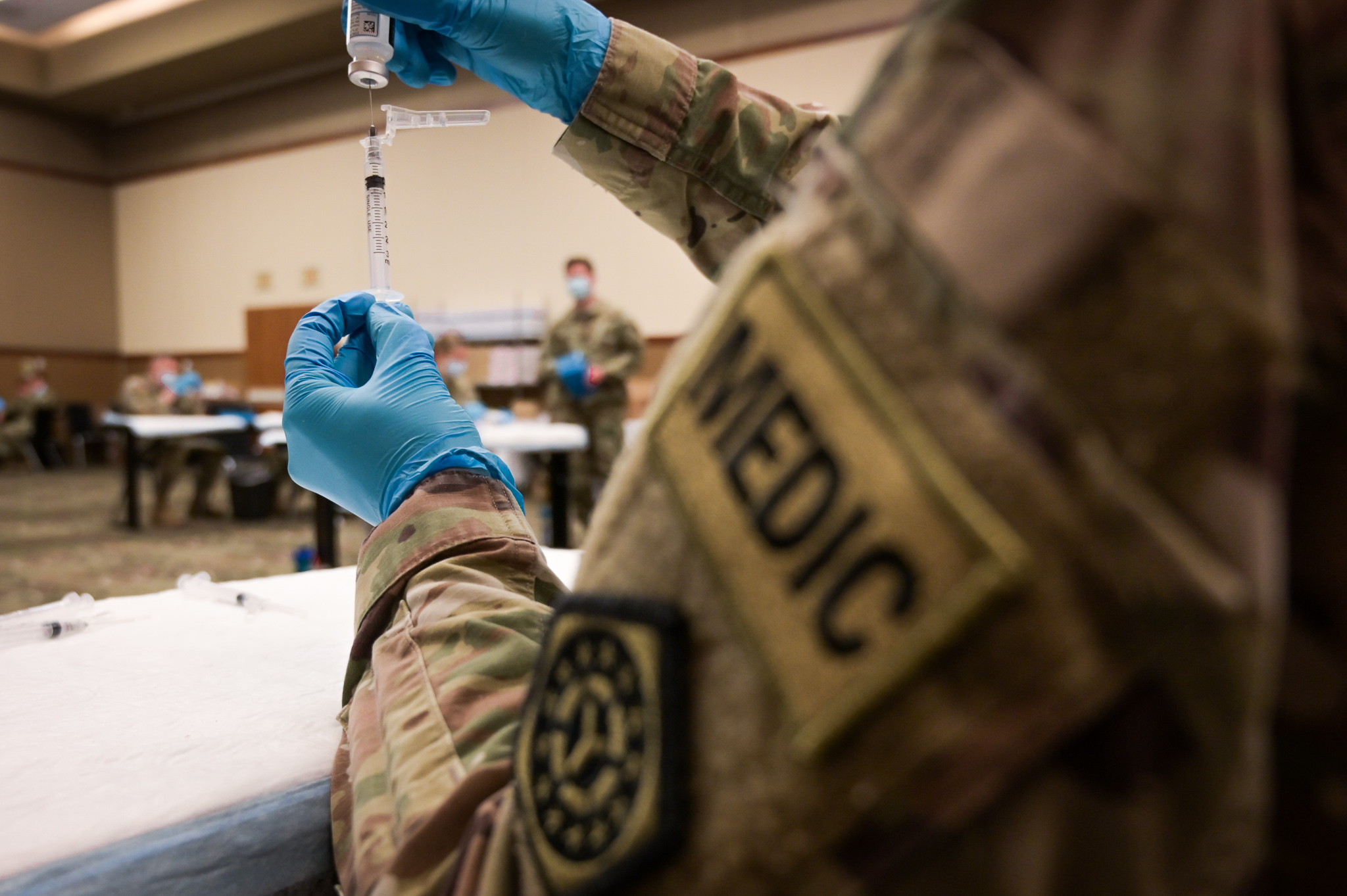 U.S. Army combat medic draws the COVID-19 vaccine into a syringe in the Tinley Park Convention Center in Tinley Park, Illinois, February 26, 2021. Medical professionals draw the vaccine as a part of the daily process to match the numbers of vaccines prepared with the number of patients receiving it. (U.S. National Guard photo by Staff Sgt. Aaron Rodriguez)