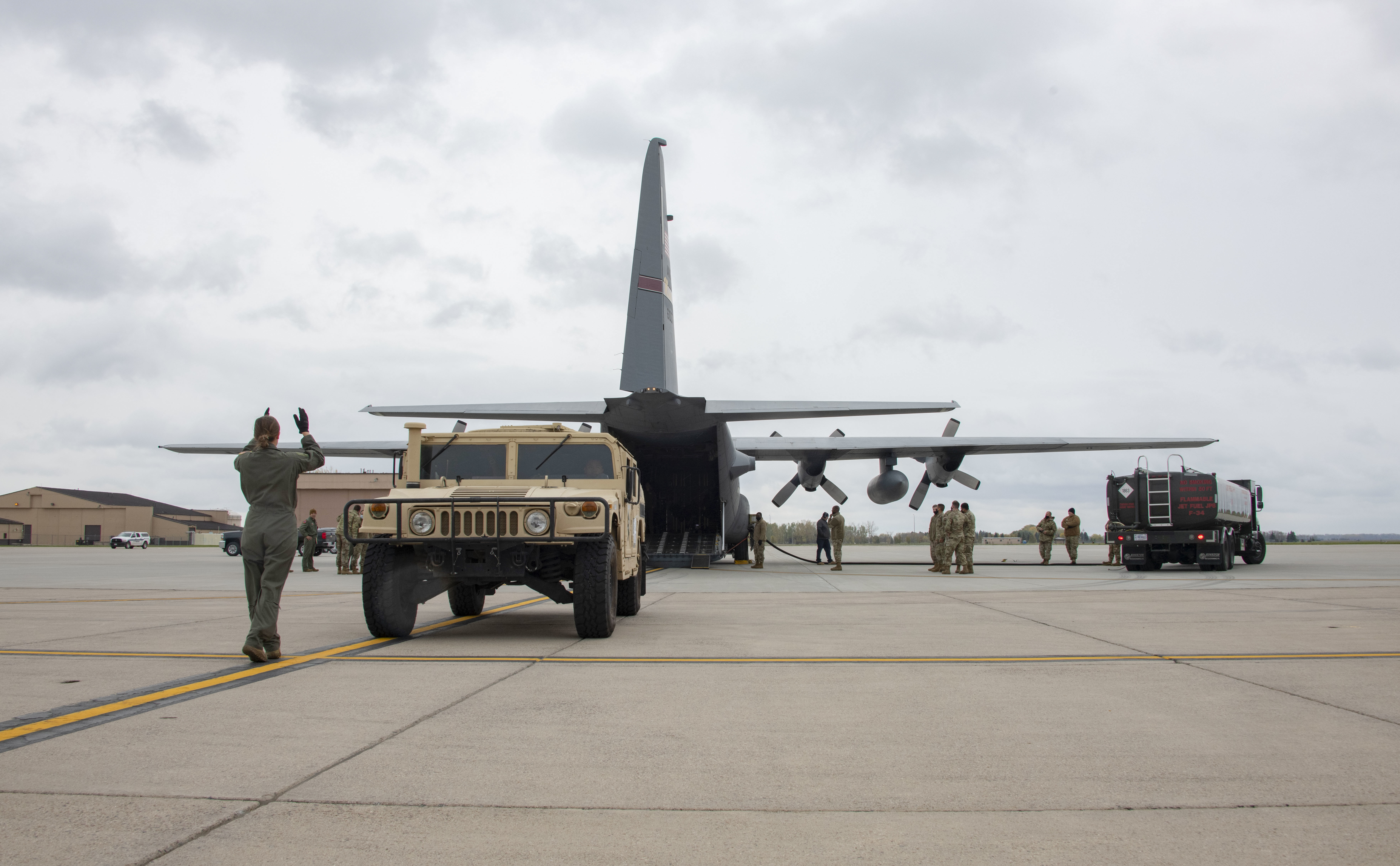 Airmen load a Humvee onto a C-130 Hercules during a readiness exercise at Grand Forks Air Force Base, North Dakota, Oct. 16, 2021. The Humvee, along with government vehicles and various pallets of cargo, were loaded and unloaded from the aircraft as training for members of the 319th Logistics Readiness Squadron. (U.S. Air Force photo by Senior Airman Dakota C. LeGrand)