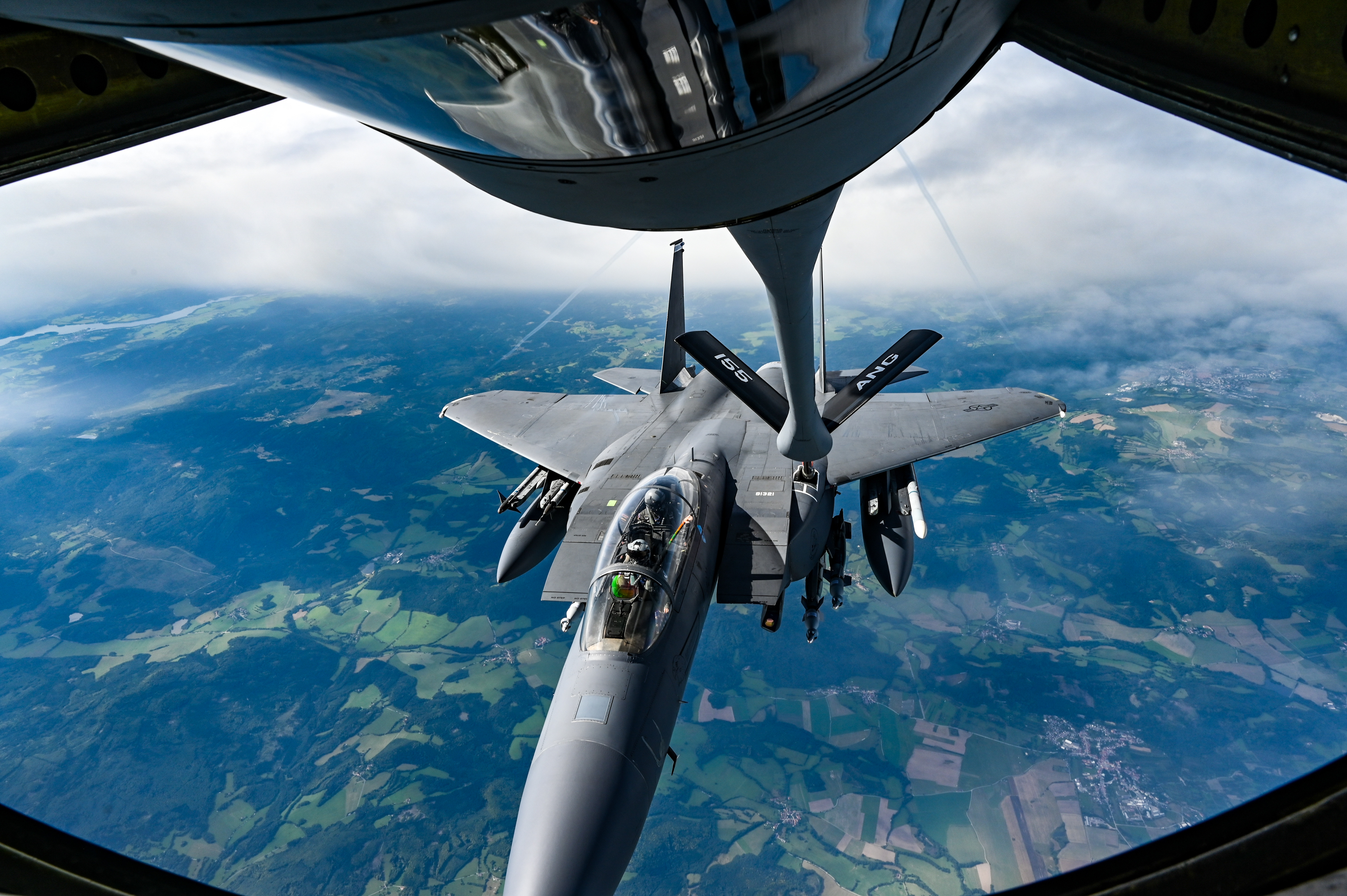 An F-15E Strike Eagle assigned to the 48th Fighter Wing, RAF, Lakenheath, England, is refueled by a U.S. Air National Guard KC-135R Stratotanker from the 155th Air Refueling Wing, Nebraska ANG, Sept. 15, 2021, during exercise Ample Strike 2021, near Pardubice Airport, Czech Republic. Ample Strike is a Czech Republic-led, multi-national live exercise that offers advanced Air/Land Integration Training to Joint Terminal Attack Controllers in coordination with MQ-9 Reaper aircraft, and F-15E Strike Eagle aircraft. Events such as Ample Strike provide vital opportunities, not only for multiple United States services to work together, but also for integrated, total force training with Reserve and National Guard units and our partner nations’ militaries to ensure interoperability. (U.S. Air National Guard photo by Airman 1st Class Alexander D. Schriner)