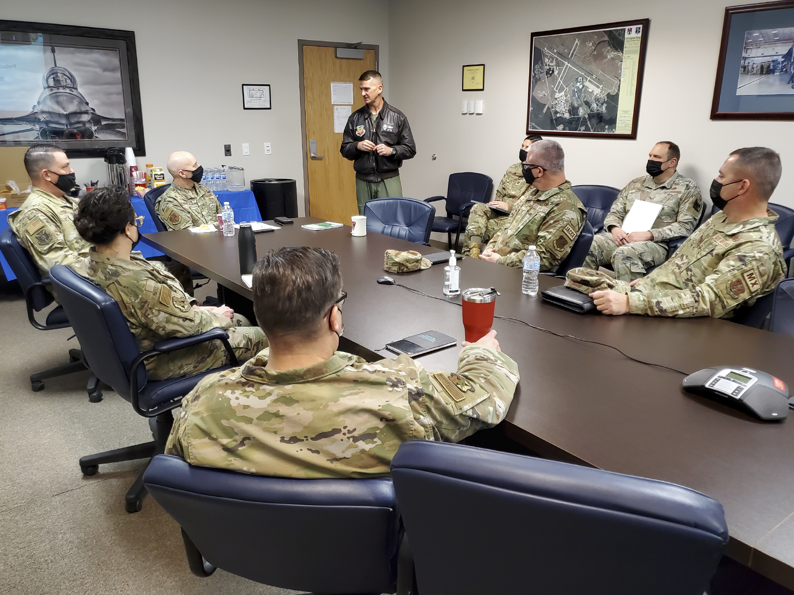 U.S. Air Force Col. Derek B. Routt, commander of the 177th Fighter Wing of the New Jersey Air National Guard, briefs Brig. Gen. Donald K. Carpenter, National Guard Bureau Director of Logistics, Engineering and Force Protection, and senior leadership during the Air National Guard's first Production Assessment Team visit, Feb. 22, 2022, at the 177FW in Egg Harbor Township, New Jersey. The Production Assessment Team's goal is to increase the number of aircraft a unit can bring to the fight, focusing on the aspects of aircraft availability that units can control - how well and how quickly they repair aircraft and how smoothly they perform scheduled maintenance. (U.S. Air National Guard photo by Senior Master Sgt. Andrew J. Moseley)