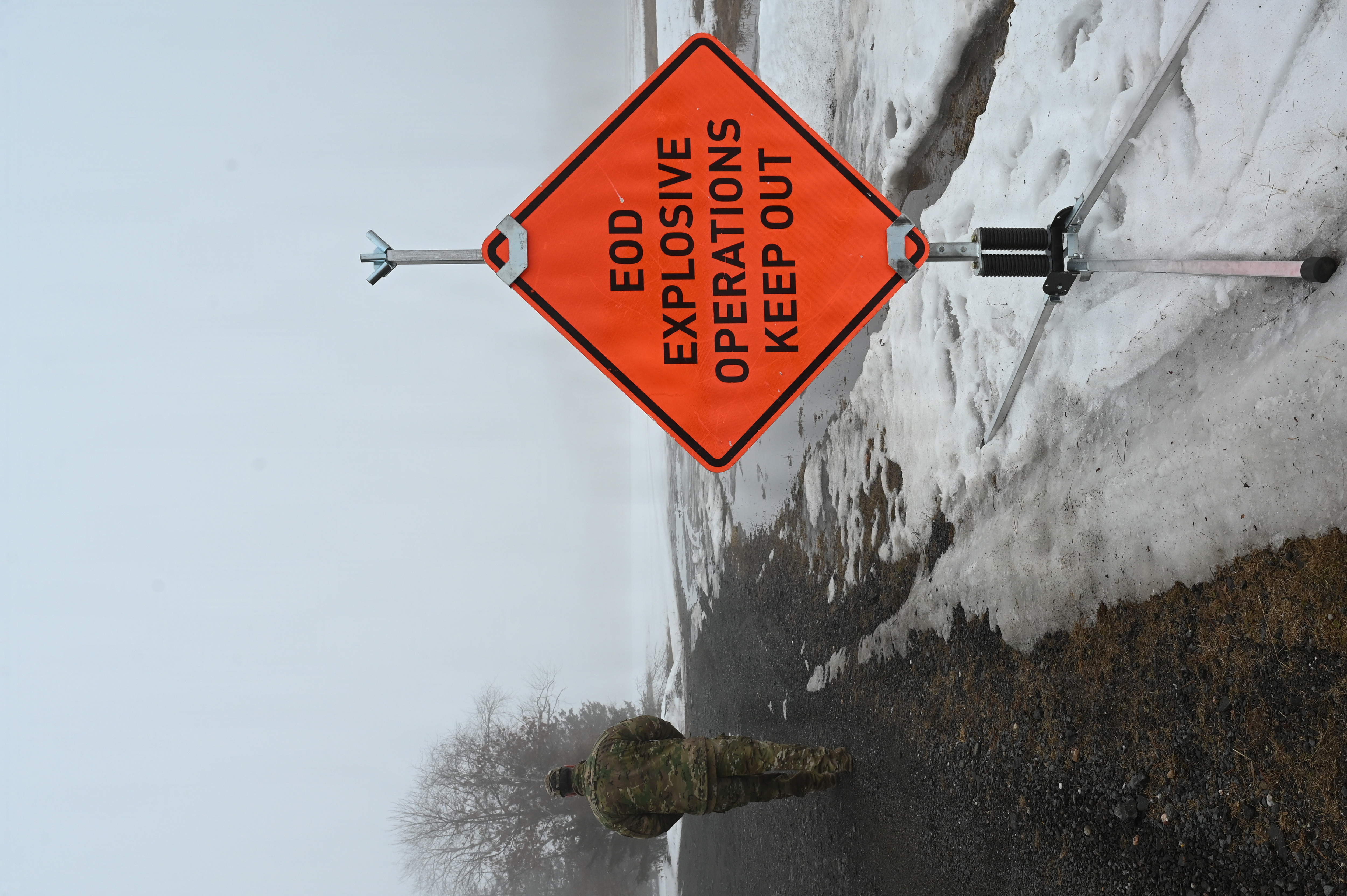An Airman with the 104th Wing, Massachusetts National Guard, walks past a fluorescent sign cautioning of explosive operations at Barnes Air National Guard Base, Westfield, Mass., March 8, 2026. The Explosive Ordinance Disposal (EOD) team performed monthly detonations to meet training requirements. (U.S. Air National Guard Photo by Airman 1st Class Ellen Ozkaptan)